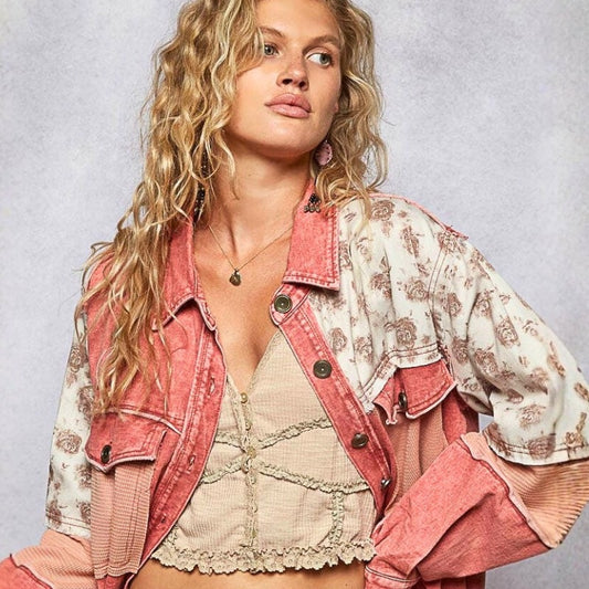 French Terry and Floral Contrast Jacket in Sunset Coral