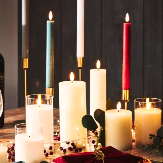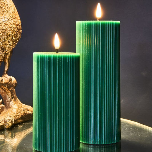 Pair of Ribbed Pillar Candles in Green - Battery Operated