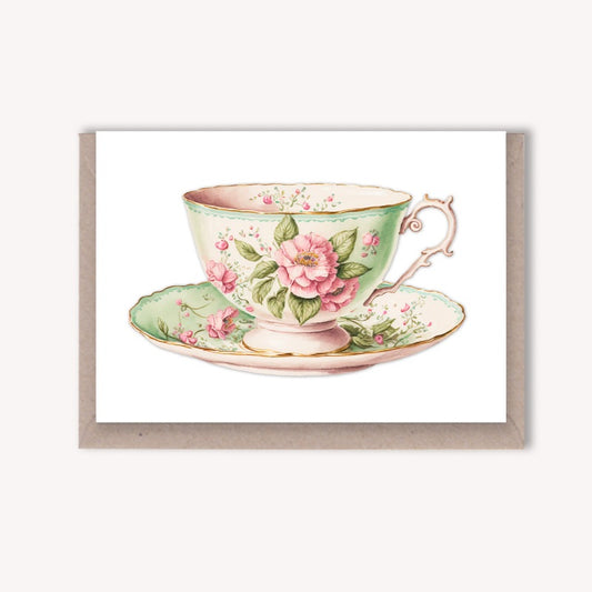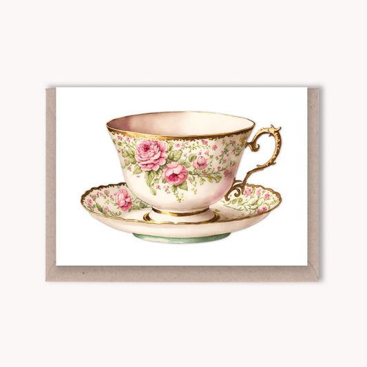 Vintage Teacup Greeting Card - Pink Rose Ivory