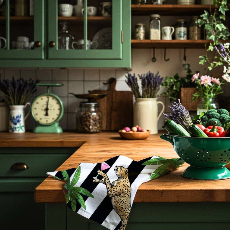 The Cocktail Cheetah Tea Towel brings unapologetic fun and vintage flair straight into your home. Designed by Karen Hurley for the Queen K collection, this striking black-and-white striped beauty features a pair of cheeky cheetahs enjoying cocktails — because even drying dishes deserves a little drama.