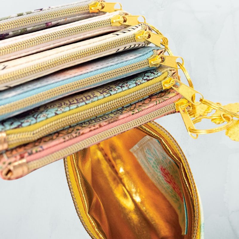 Perfectly sized to hold business cards, cash, keys, cosmetics, credit cards, or spare change, it slips easily into any bag and keeps your little treasures together! The slim, lightweight design is crafted from soft, durable faux leather with shimmering gold metallic lining for an added touch of luxe.
