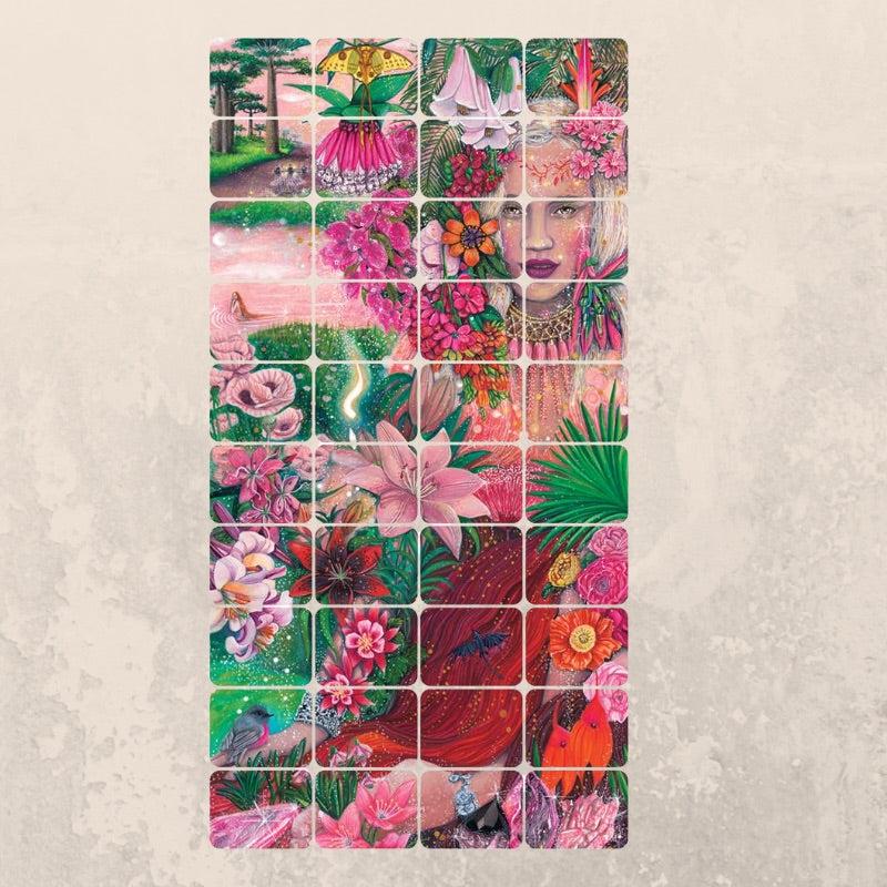 At its heart is one stunning hand-painted artwork — an alluring, empowered woman surrounded by a lush, wild, and colourful garden. This breathtaking image is divided into forty cards, each labeled 1–40.